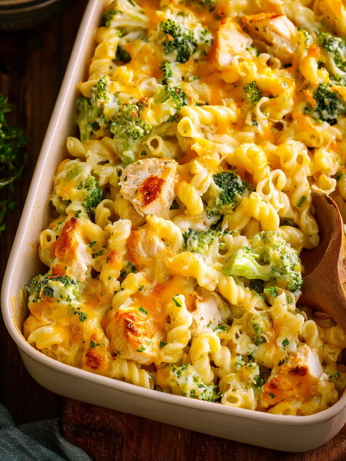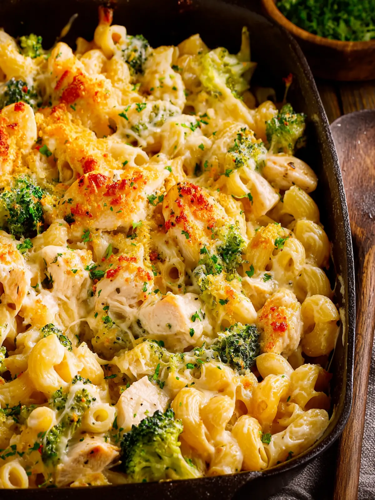 A comforting and cheesy chicken pasta bake filled with broccoli and rich flavors.