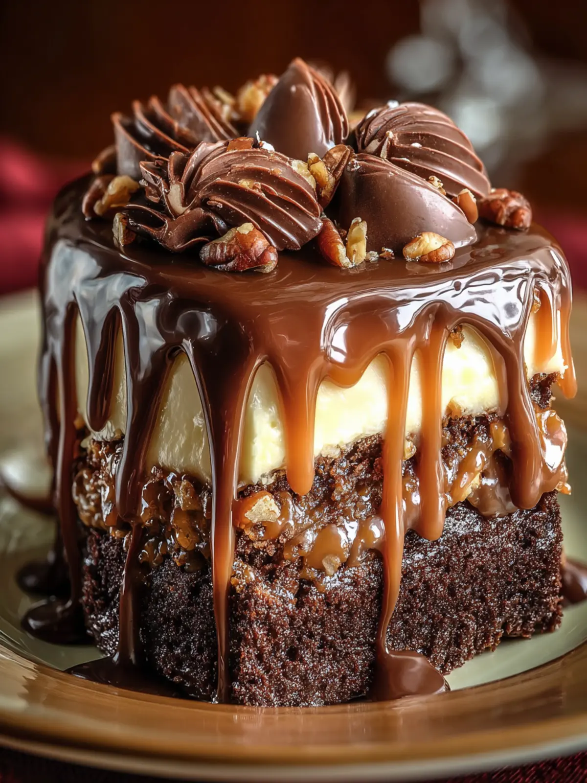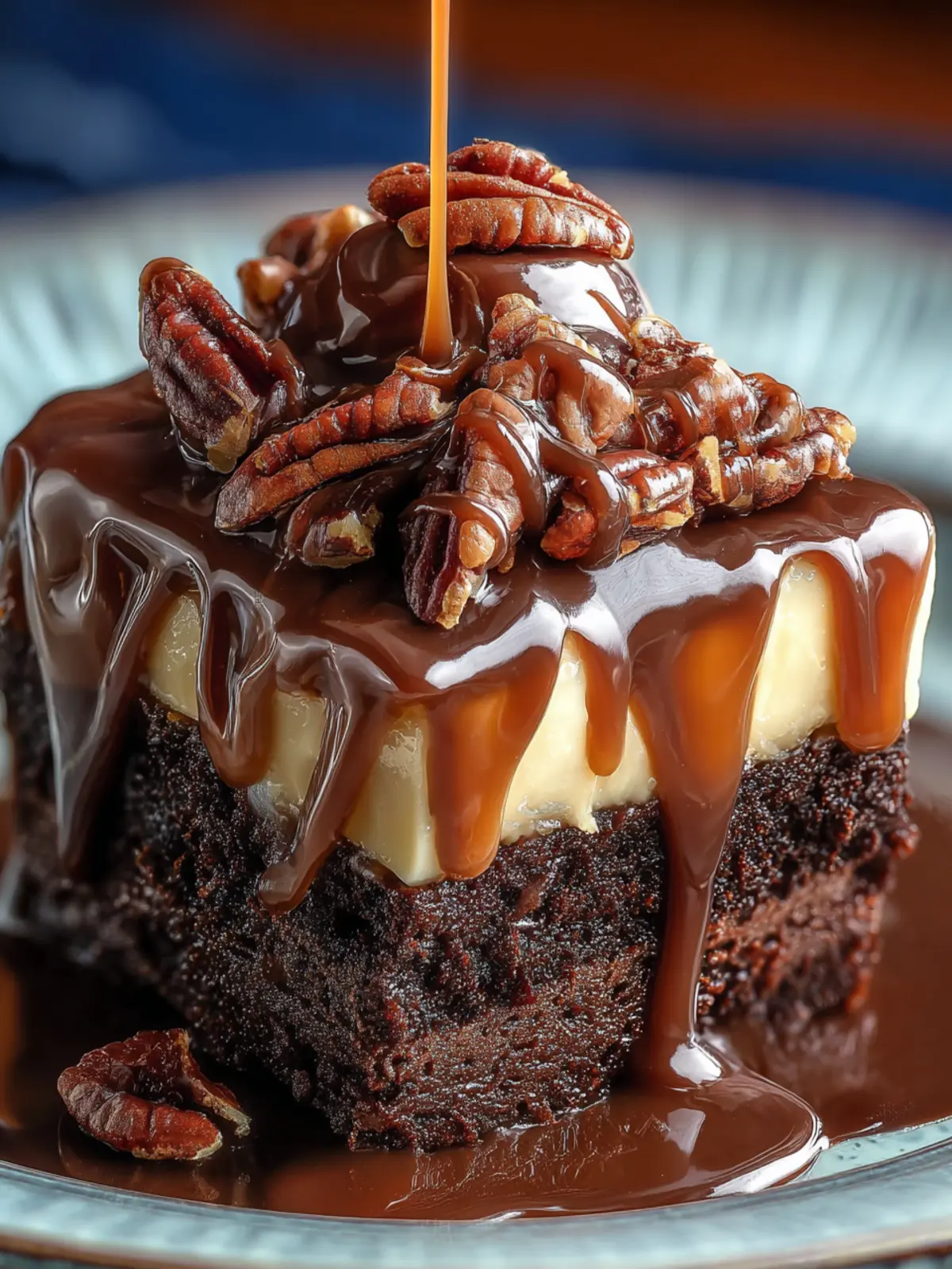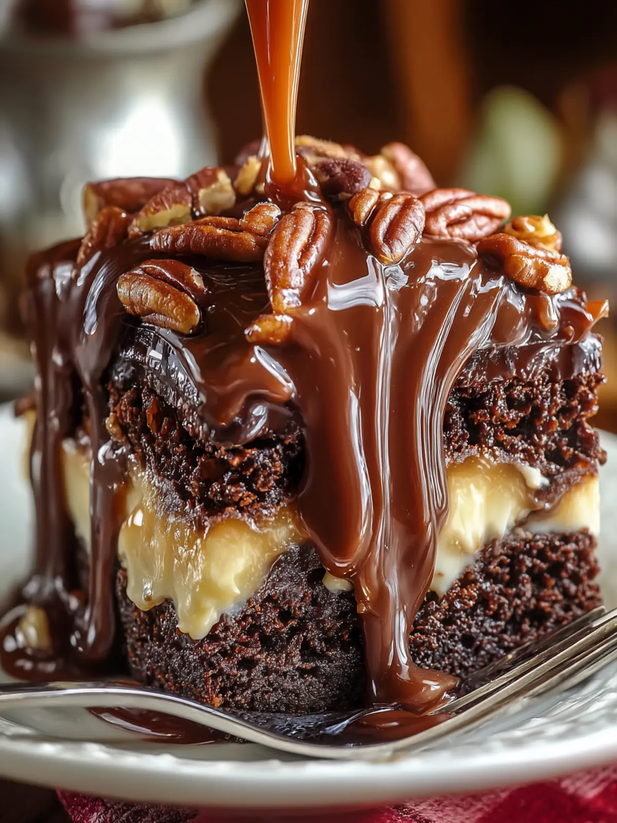 A rich and moist chocolate cake topped with caramel, pecans, and melted chocolate.