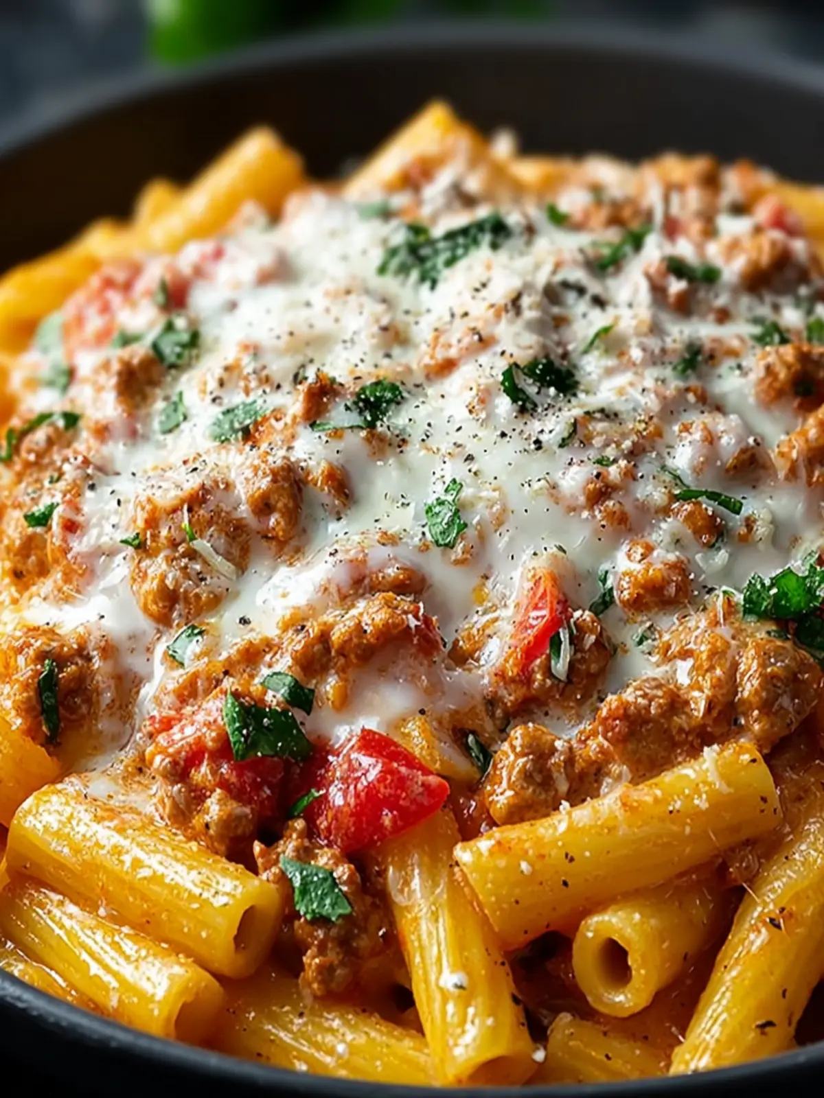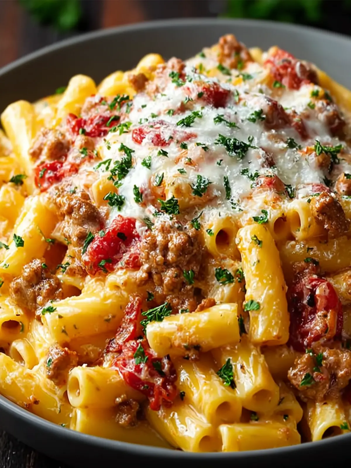 A delicious creamy pasta dish made with ground turkey, cheese, and a rich sauce.