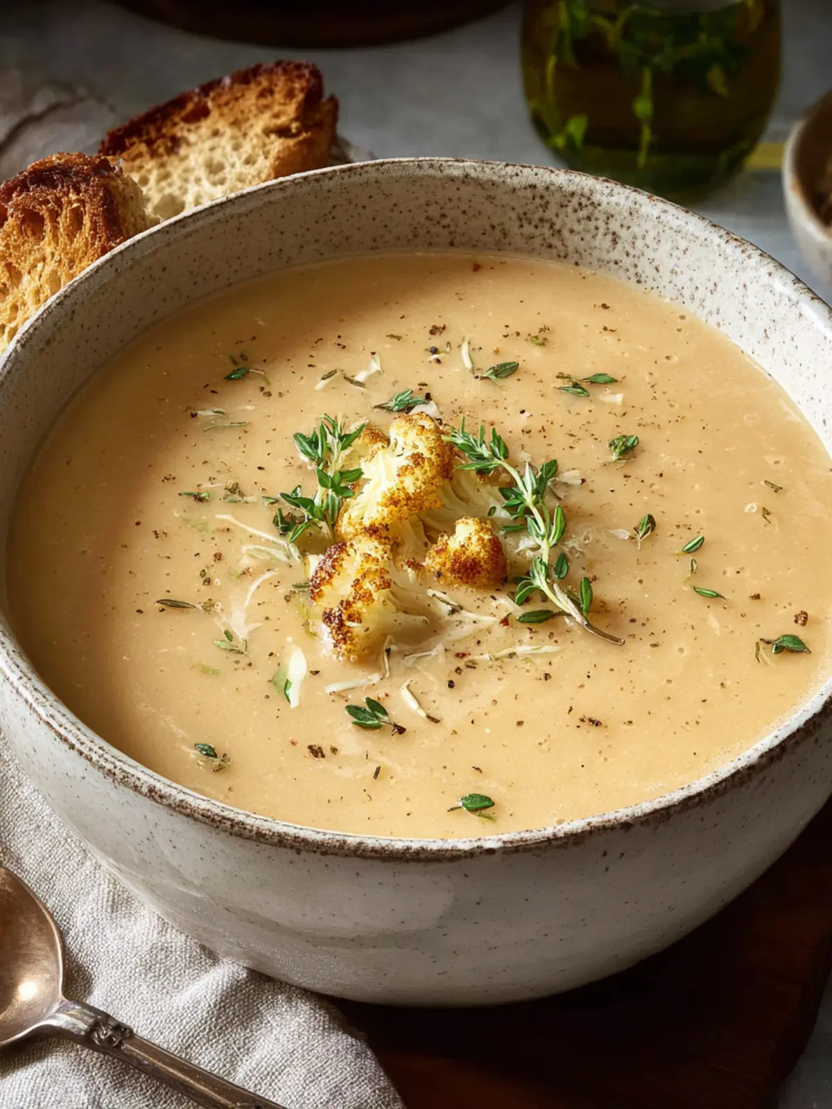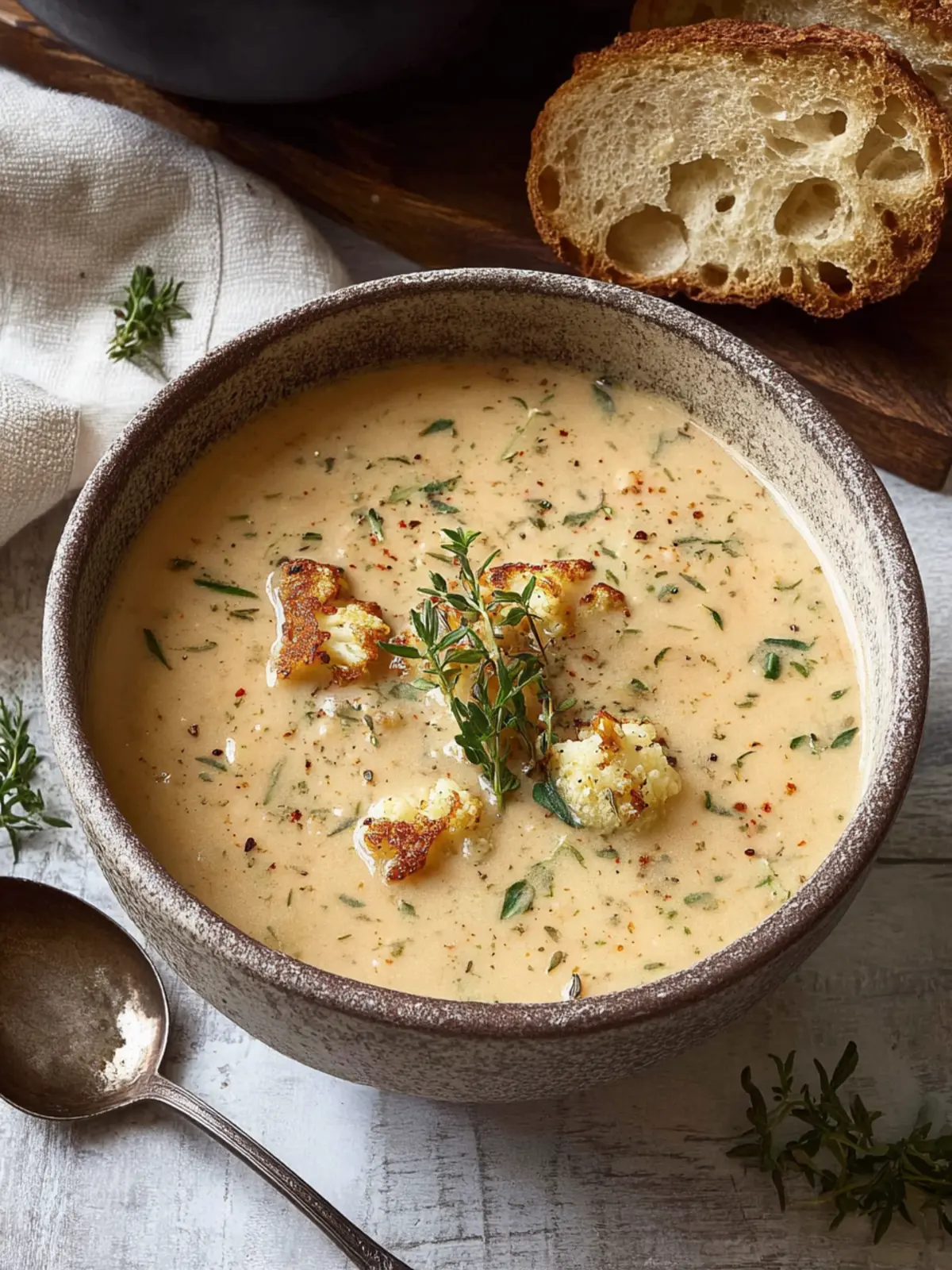 Thyme: This herb is the perfect partner for our creamy roasted cauliflower soup, delivering an aromatic, earthy flavor. Fresh thyme is ideal, but dry thyme can work in a pinch—just adjust the quantity to your taste.