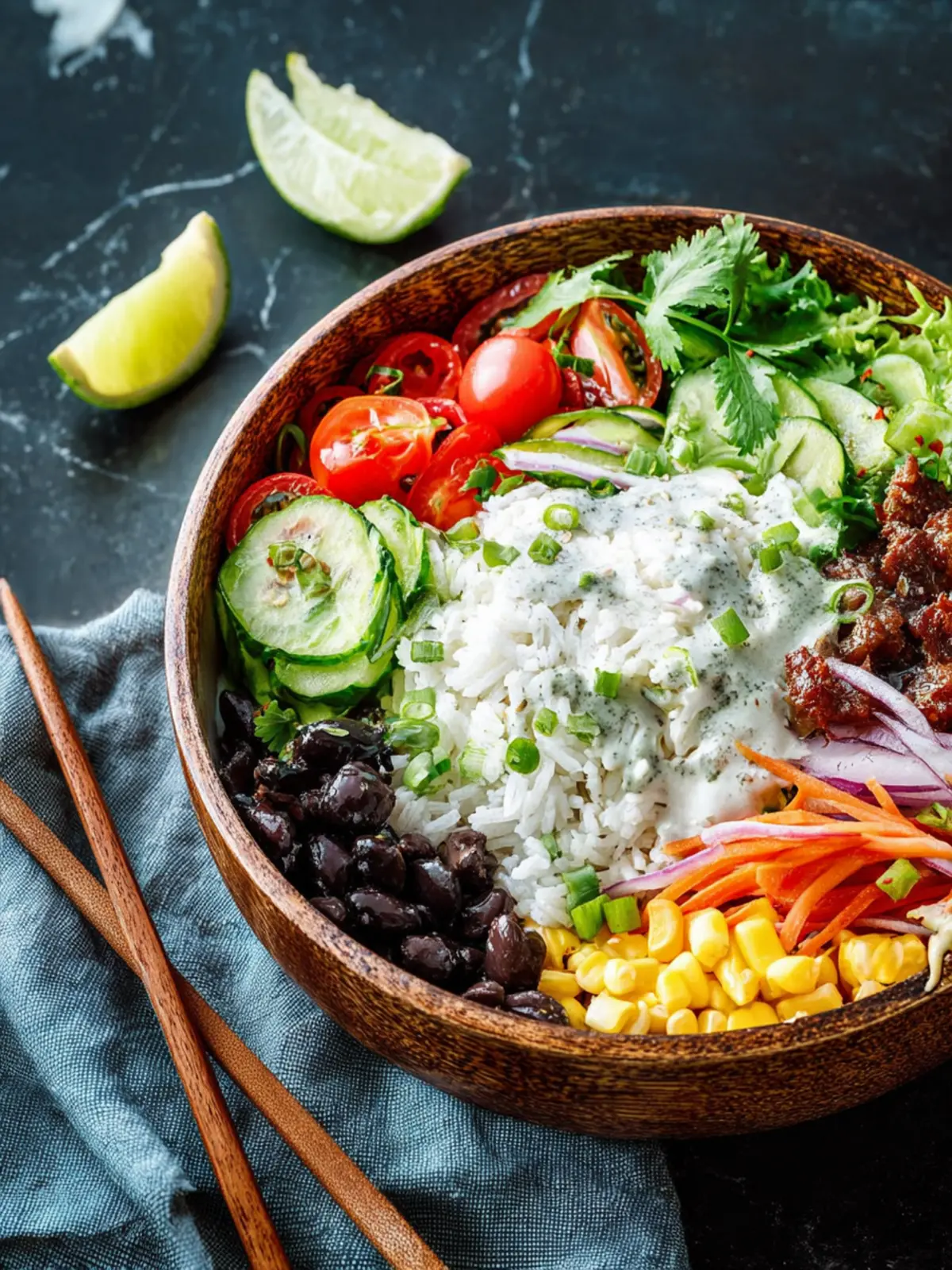 A delicious and nutritious black bean rice bowl topped with fresh vegetables and a flavorful sauce.