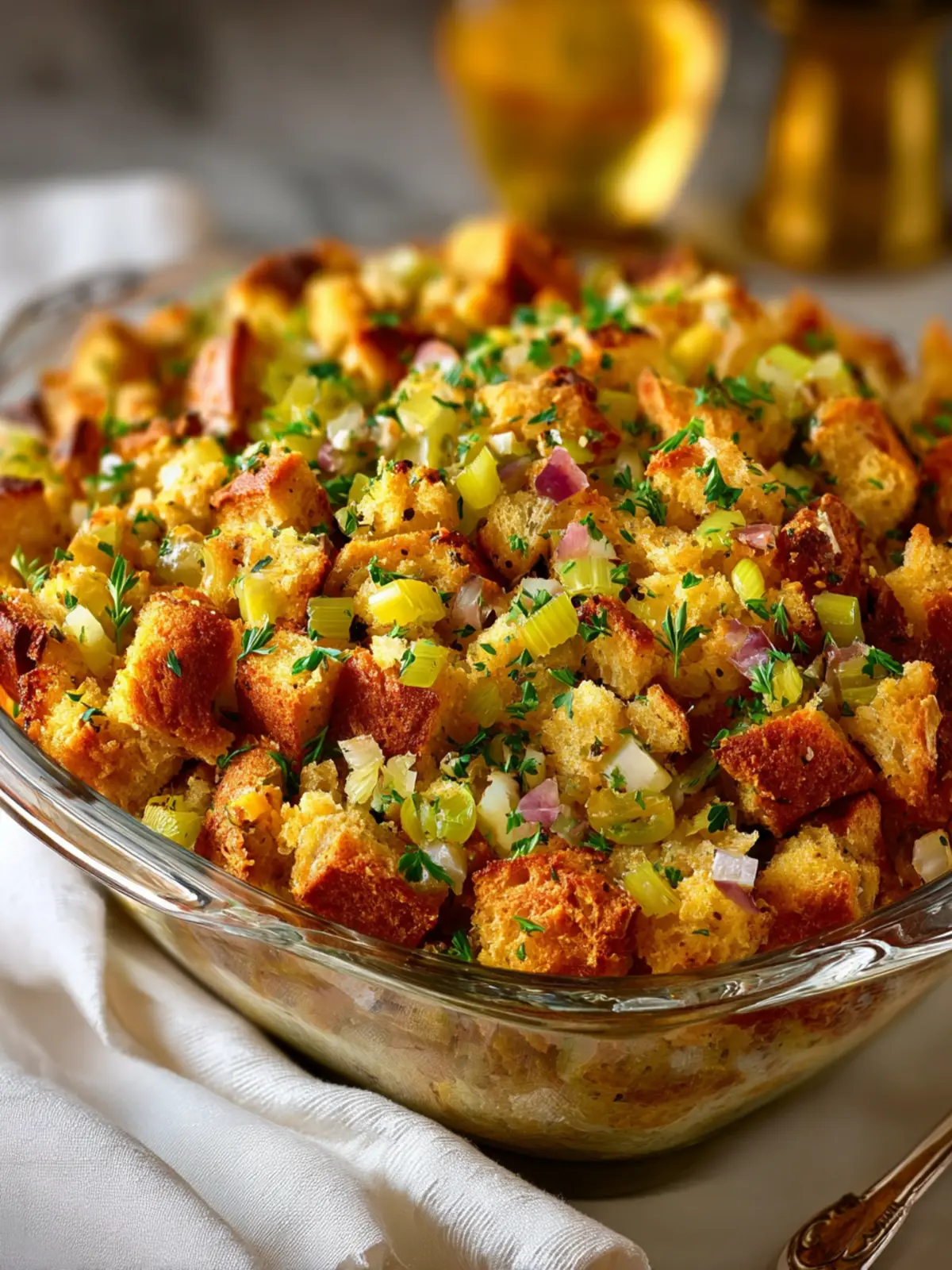 • Celery and Onion: The aromatic duo of celery and onion is essential for building the base flavor. Sautéing them in butter infuses the stuffing with warmth and heartiness that reminds you of home.