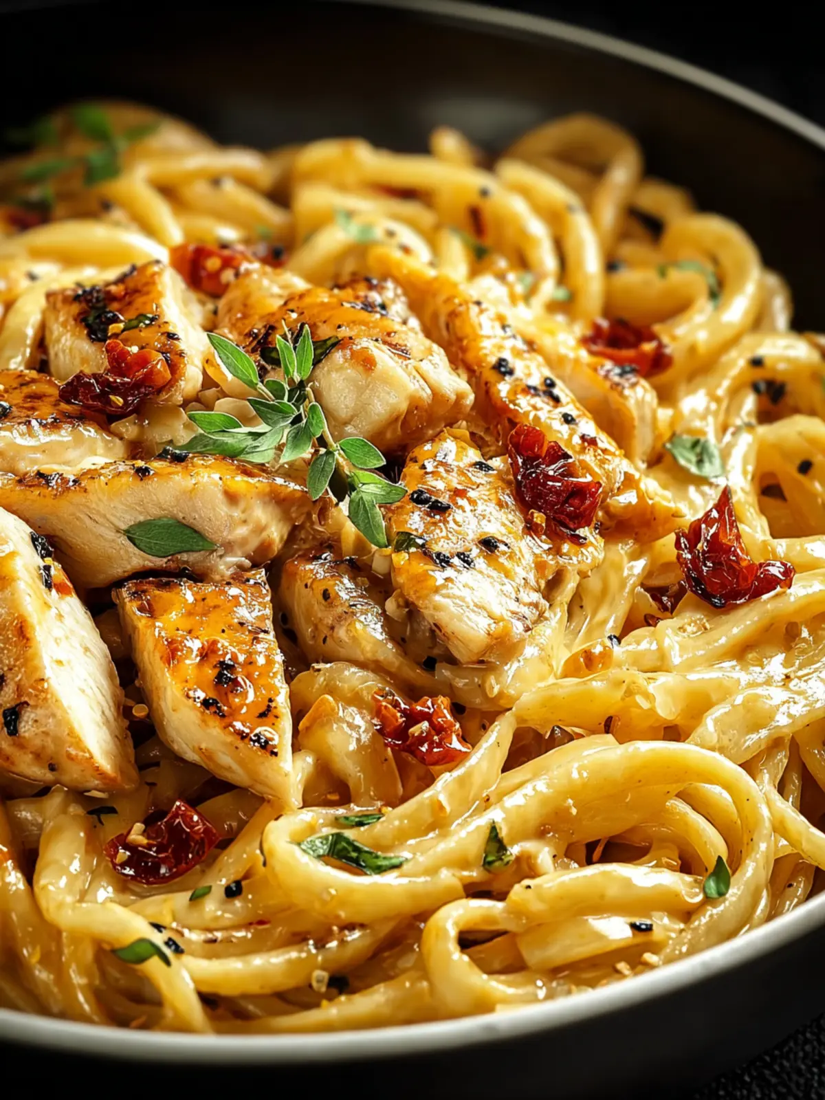 A delicious creamy garlic chicken pasta made with tender chicken breasts, sun-dried tomatoes, and Parmesan cheese.