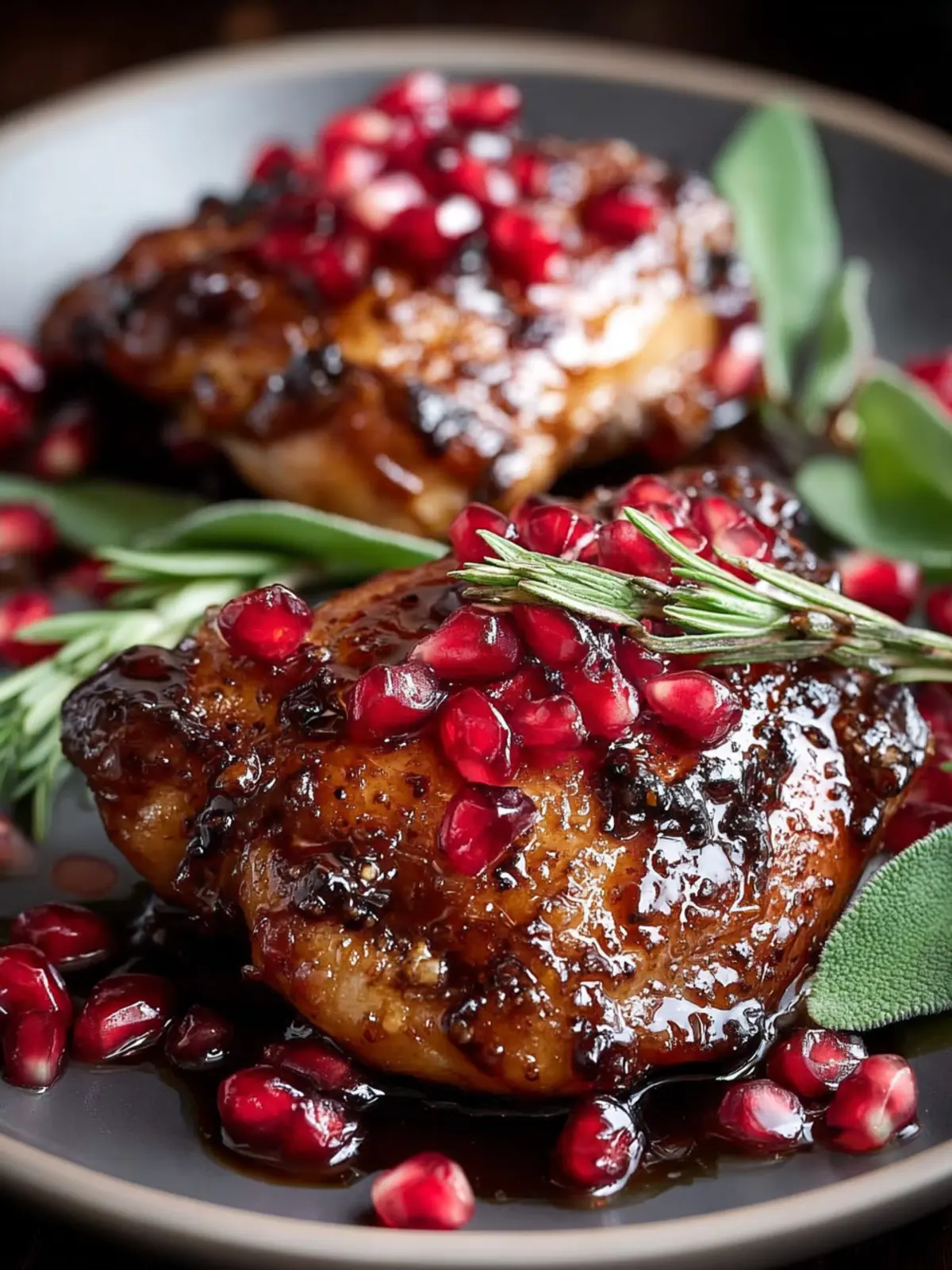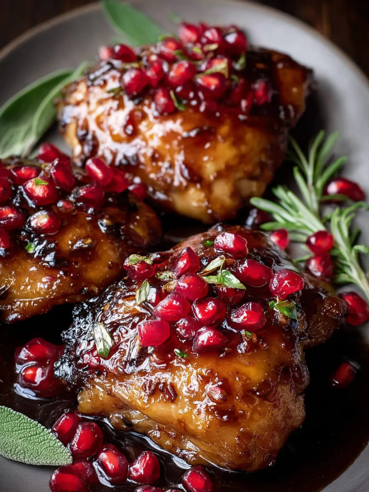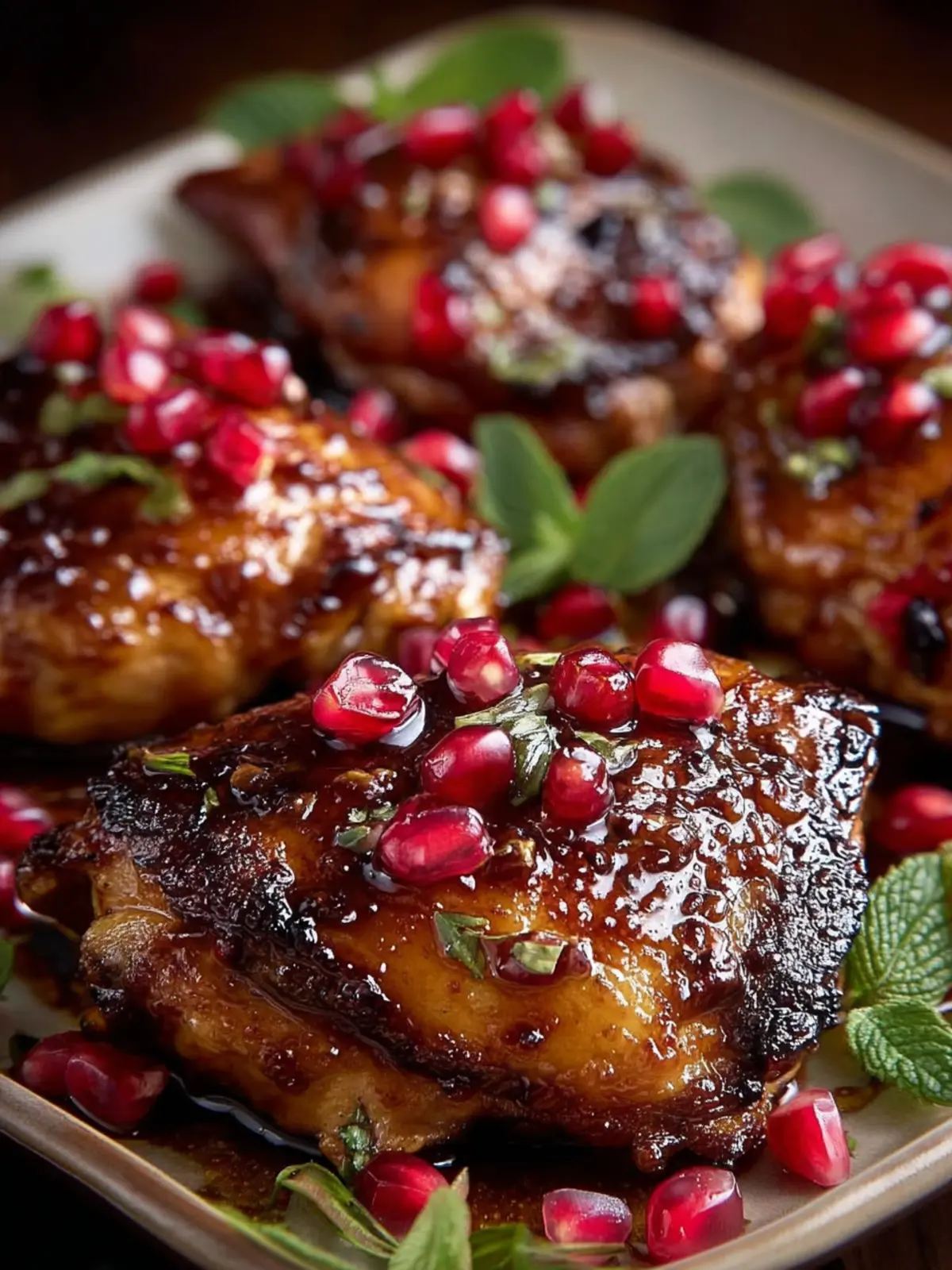 Delicious chicken thighs marinated in a sweet and tangy pomegranate glaze, roasted to perfection.