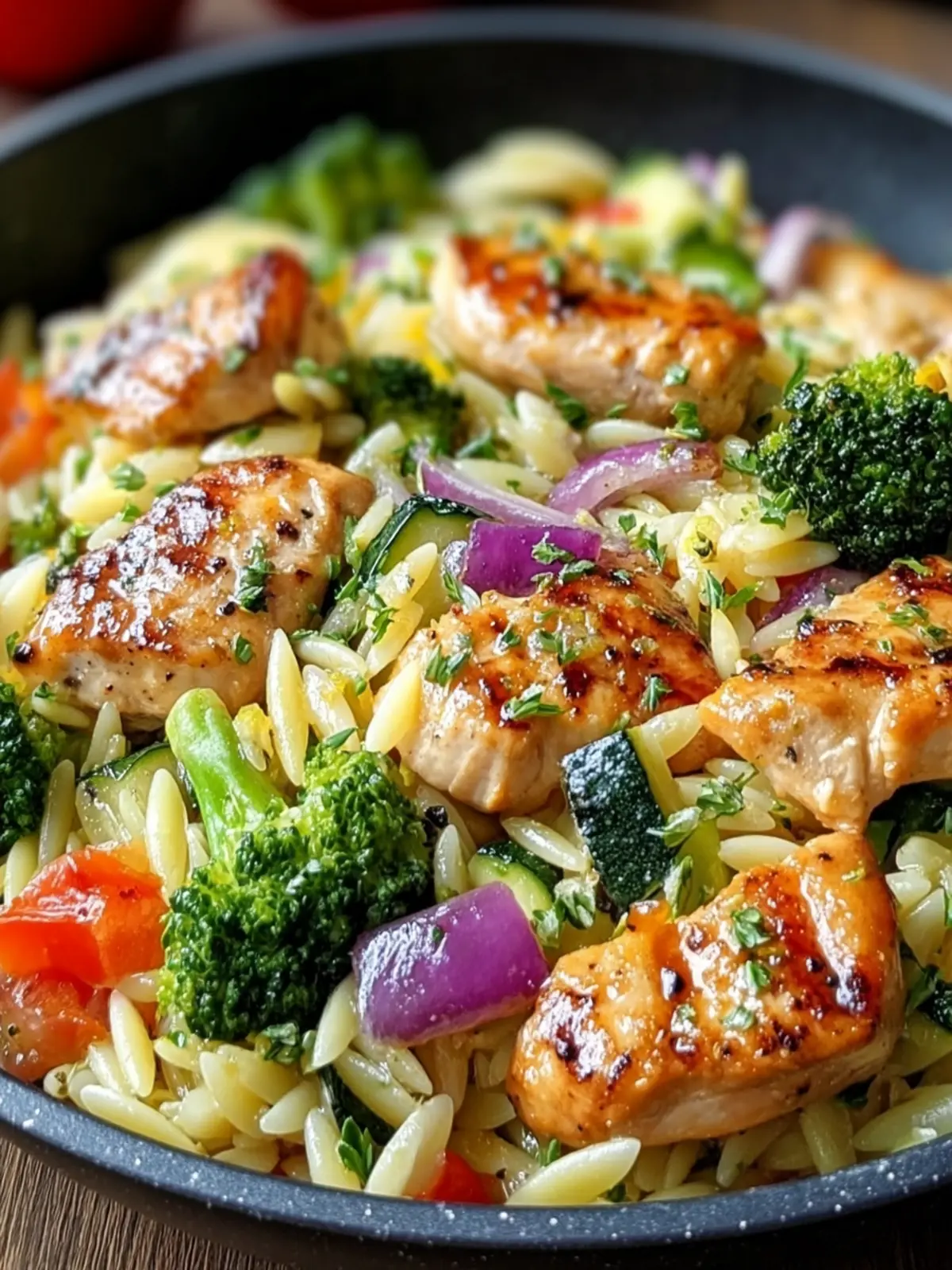 - Transfer the Lemon Chicken & Veggie Orzo Stir Fry to a serving dish or individual bowls. Garnish with fresh parsley if desired to add a pop of color and freshness. Serve immediately.