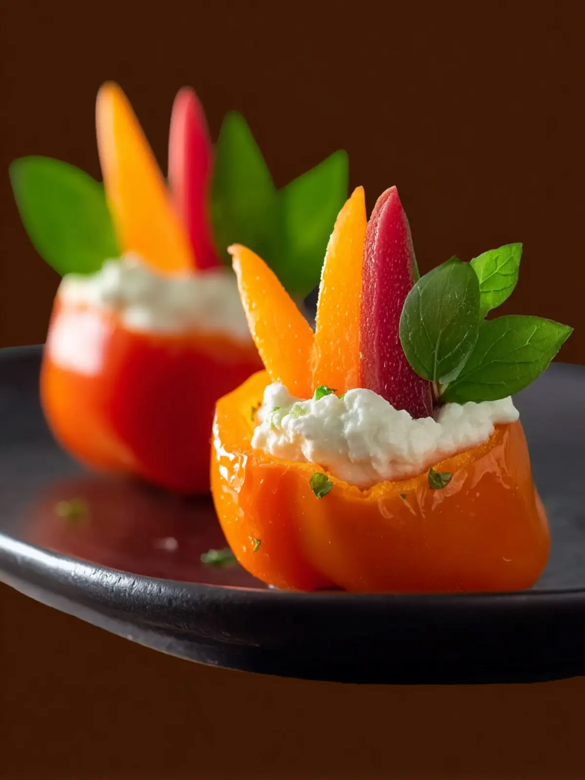 A delicious and visually appealing appetizer featuring mini bell peppers stuffed with a creamy herb mixture.