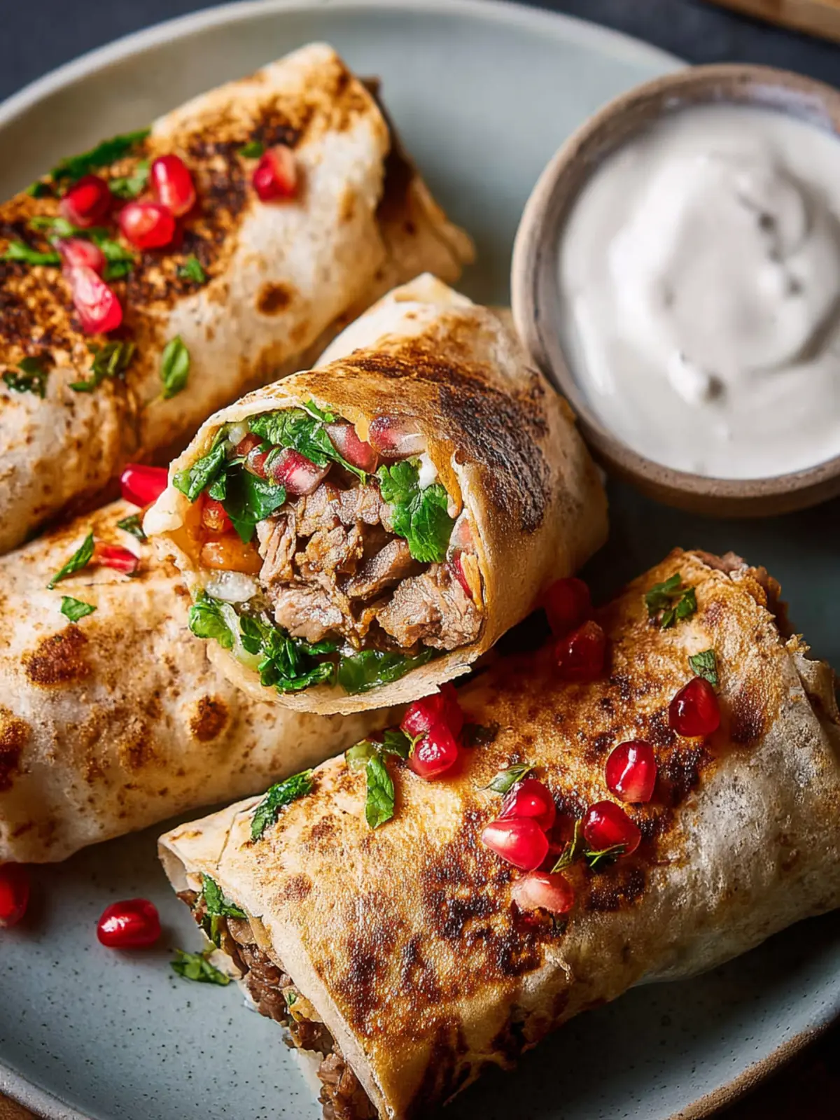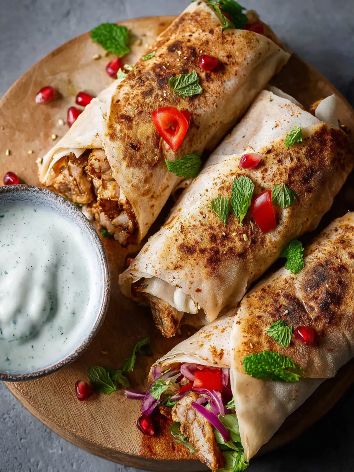 Delicious and crispy rolls filled with spiced chicken, onion, and nuts, garnished with pomegranate seeds and served with yogurt.