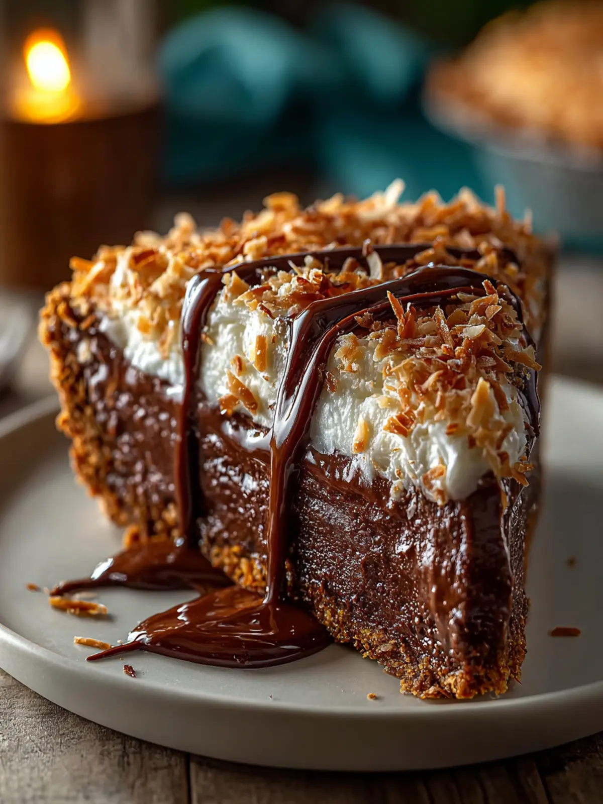 This chocolate coconut pecan pie combines a rich chocolate filling with layers of coconut and pecans, all nestled in a chocolate cookie crust.
