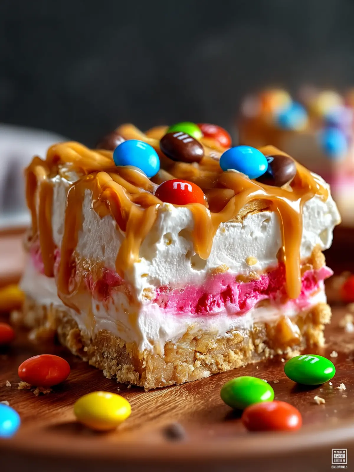 • Be Generous with Toppings: M&M’s and caramel are stars in this recipe, so don’t hold back. Sprinkle a generous layer of M&M’s on top before placing it in the fridge for an eye-catching finish!