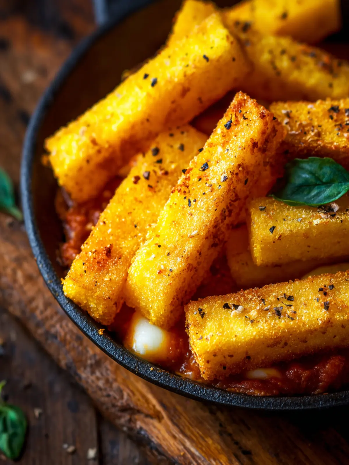 Delicious crispy polenta fries served with a warm marinara sauce and garnished with burrata or mozzarella for an irresistible appetizer or side dish.
