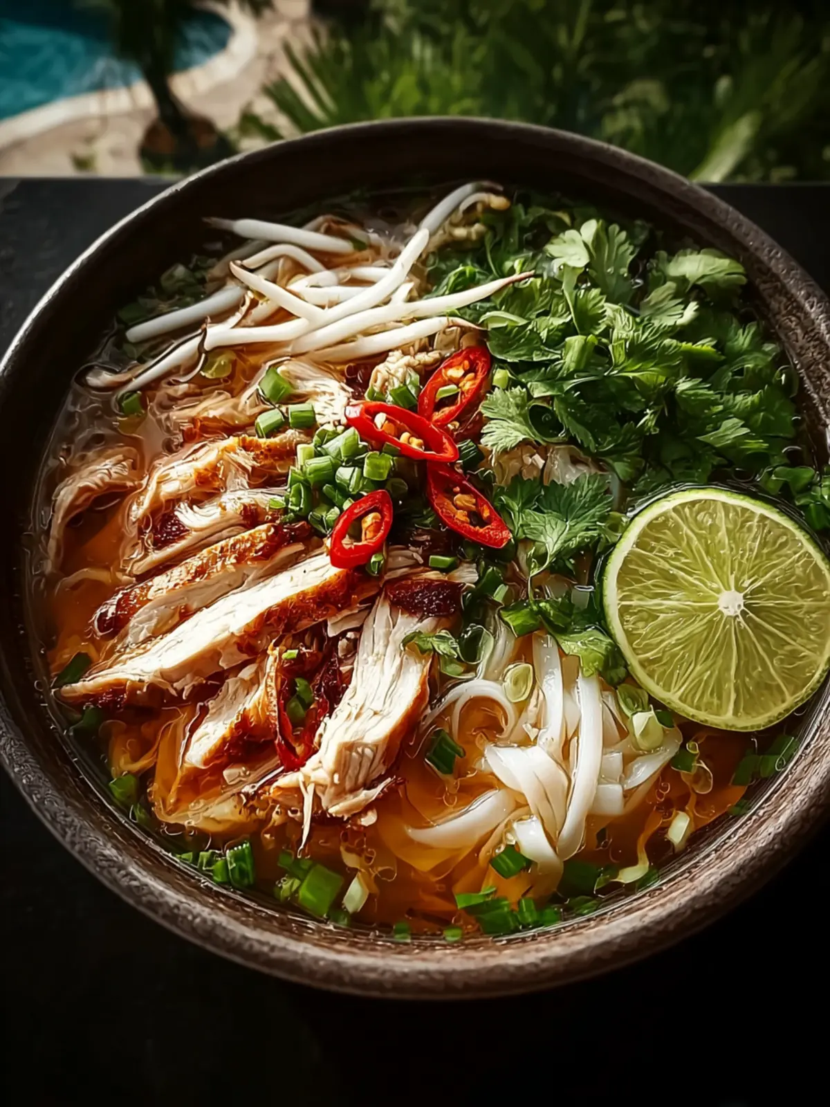 A fragrant and hearty chicken noodle soup with rice noodles, fresh herbs, and spices.